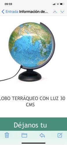 Globo terráqueo de 30 cms de diámetro. Posee una luz interior, el globo al estar apagado es mapa físico y al estar encendido es mapa político.